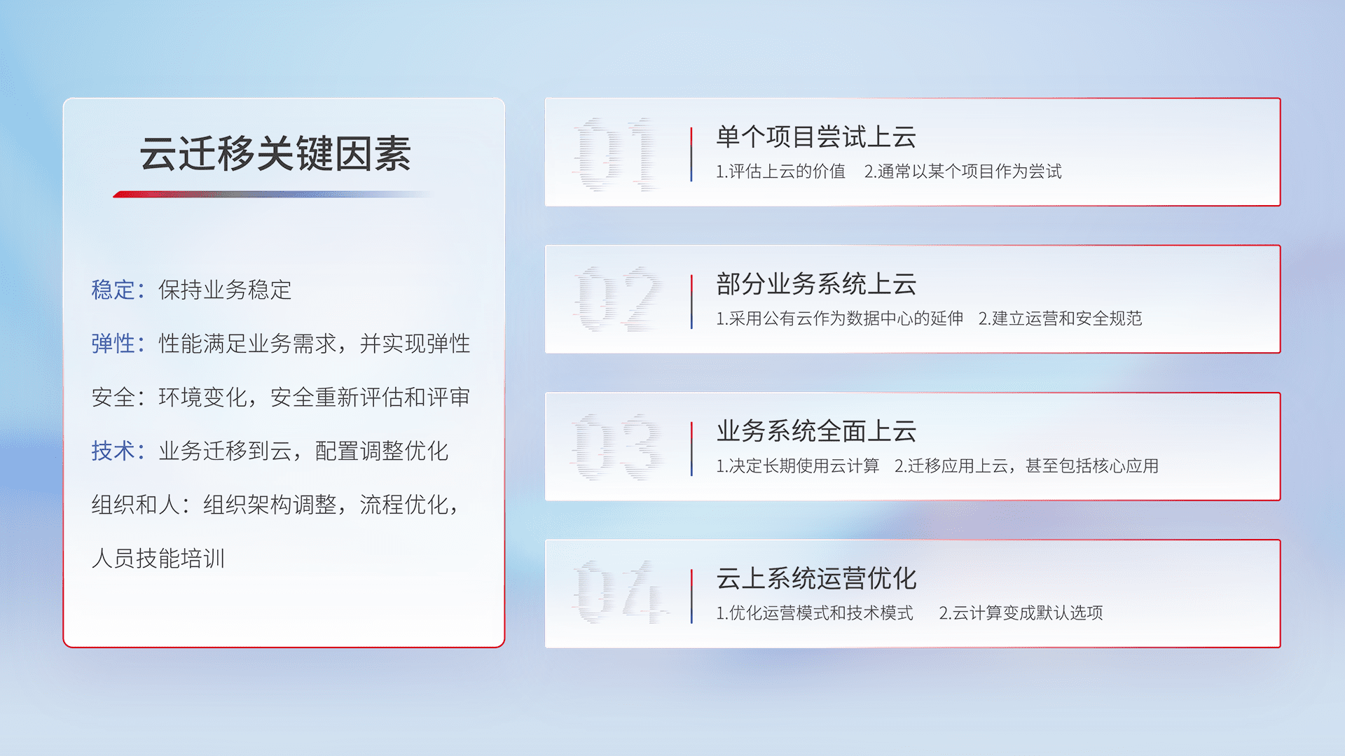 结合实际业务,,,,从规划设计、、、、云平台选型、、、云原生改造、、数据迁移、、、、集成交付,,,,迁移全过程为客户识别最佳上云路径,,,,做好风险识别管理,,,,设计网络架构、、身份权限、、、、安全审计合规、、、、操作审计、、、、日志审计、、、监控告警策略、、、、多站点容灾设计等,,对云上基础设施进行整体规划,,,,提升IT治理水平,,以满足弹性、、、、高可用、、、高性能的需求。。