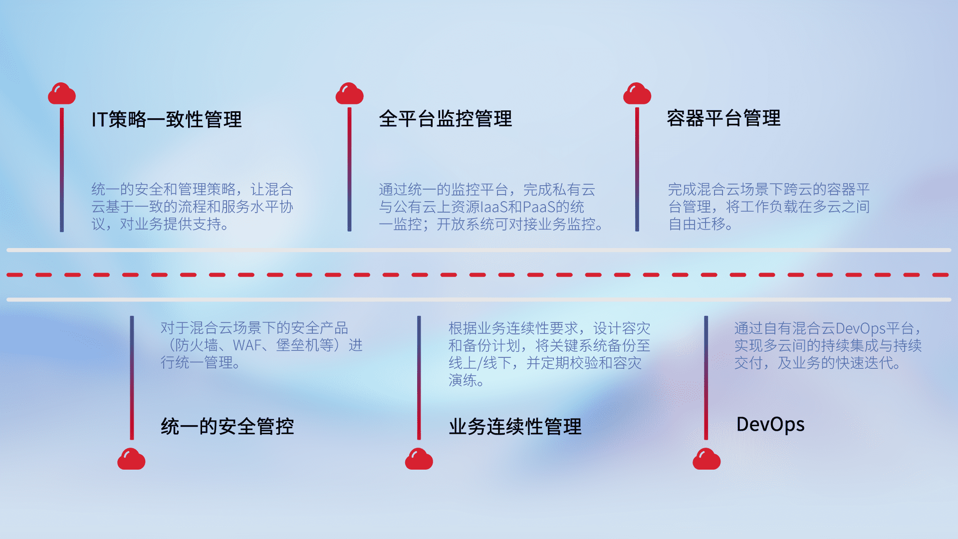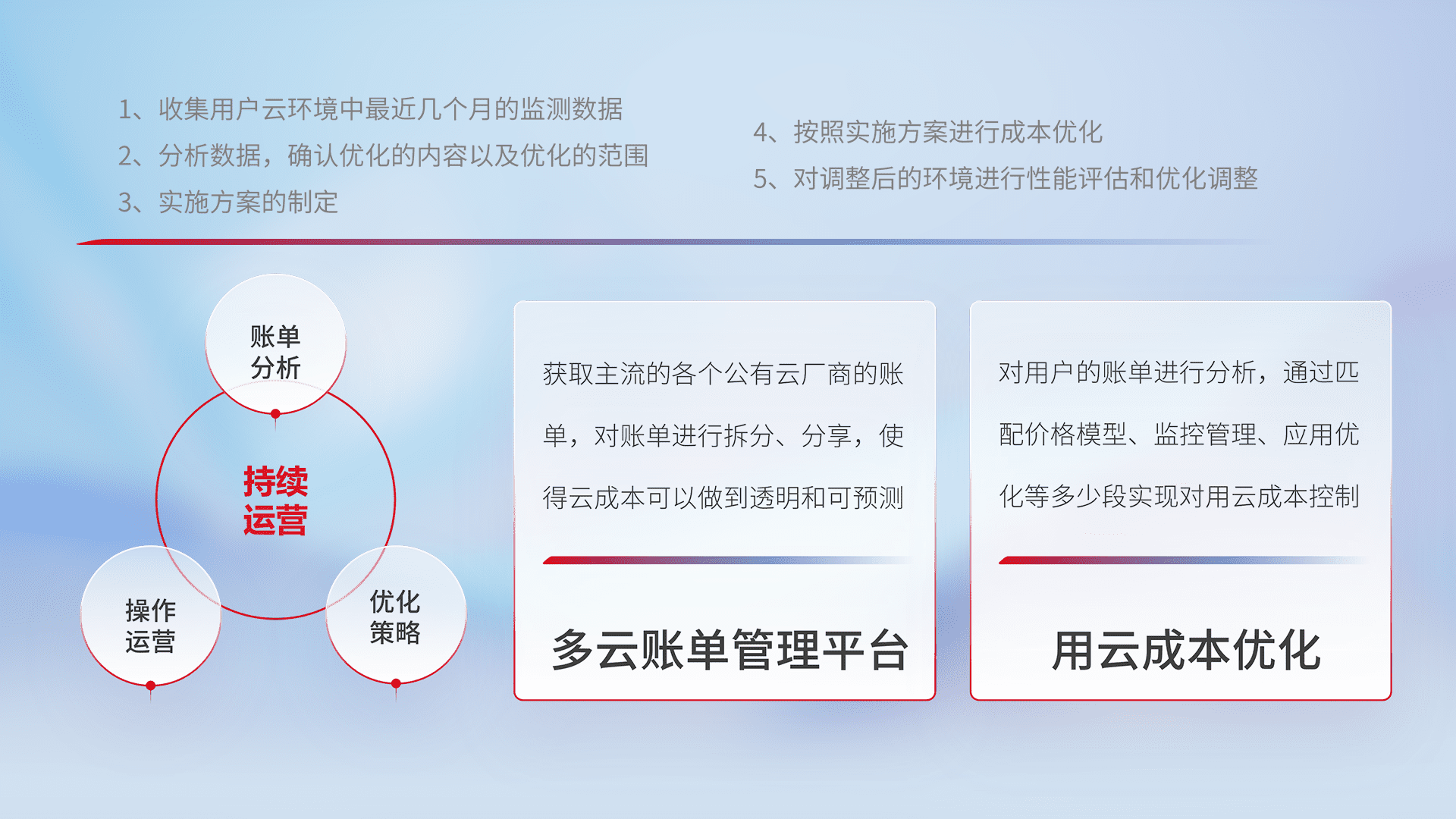 通过多云纳管,,以统一的资源数据模型把客户的云资源进行抽象和封装,,,,进而实现对多云资源的统一操作,,,保障云资源管理的可靠性、、稳定性与可用性。。量身定制化运维内容,,,配置、、开发运维、、、、补丁管理、、、备份、、、监控、、、认证和访问管理、、审计和日常巡检等,,,保障在用云过程中的可靠度,,稳定度以及高可用率。。。。